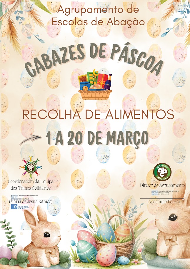 A nossa escola está a promover uma recolha de alimentos para os cabazes de Páscoa, destinados a apoiar famílias carenciadas da nossa comunidade/Agrupamento, nesta época pascal. A sua ajuda faz a diferença. Entendemos que Partilhar é o verdadeiro espírito da Páscoa. Há mesas vazias. A sua contribuição pode mudá-las.